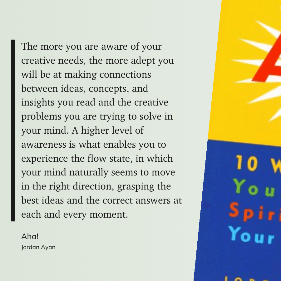 “The more you are aware of your creative needs, the more adept you will be at making connections between ideas, concepts, and insights you read and the creative problems you are trying to solve in your mind. A higher level of awareness is what enables you to experience the flow state, in which your mind naturally seems to move in the right direction, grasping the best ideas and the correct answers at each and every moment.” (Jordan Ayan, Aha!)