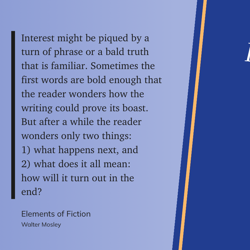 “Interest might be piqued by a turn of phrase or a bald truth that is familiar. Sometimes the first words are bold enough that the reader wonders how the writing could prove its boast. But after a while the reader wonders only two things: 1) what happens next, and 2) what does it all mean: how will it turn out in the end?” (Walter Mosley, Elements of Fiction)