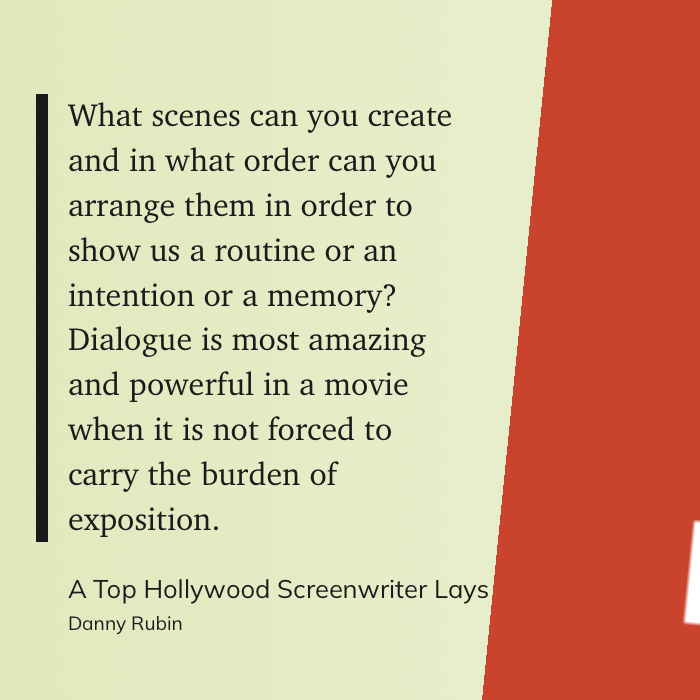 “What scenes can you create and in what order can you arrange them in order to show us a routine or an intention or a memory? Dialogue is most amazing and powerful in a movie when it is not forced to carry the burden of exposition.” (Danny Rubin, A Top Hollywood Screenwriter Lays Down His 10 Rules for Your Script – The Daily Beast)