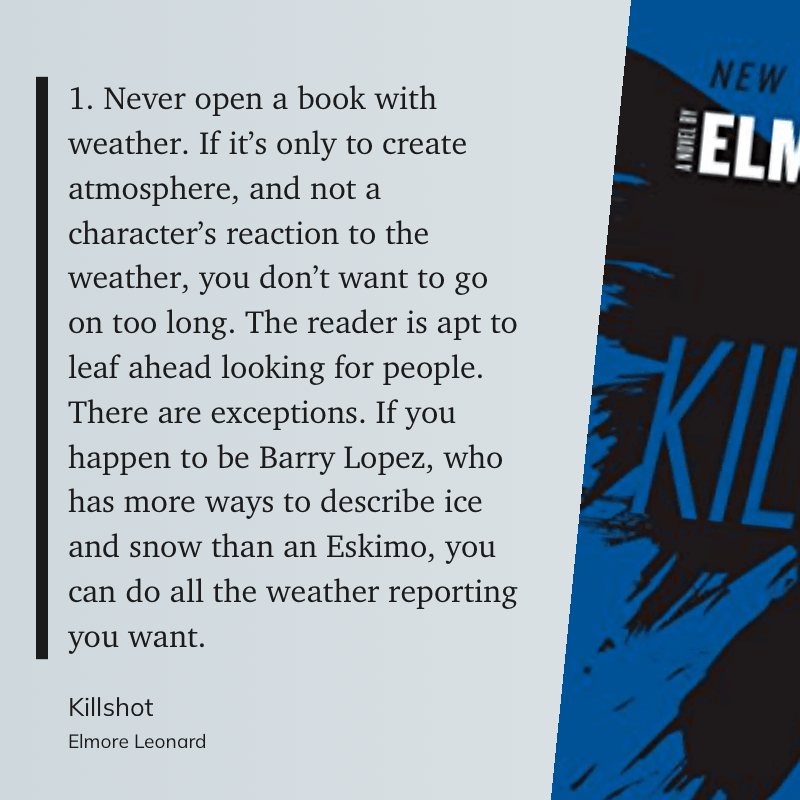 “1. Never open a book with weather. If it’s only to create atmosphere, and not a character’s reaction to the weather, you don’t want to go on too long. The reader is apt to leaf ahead looking for people. There are exceptions. If you happen to be Barry Lopez, who has more ways to describe ice and snow than an Eskimo, you can do all the weather reporting you want.” (Elmore Leonard, Killshot)