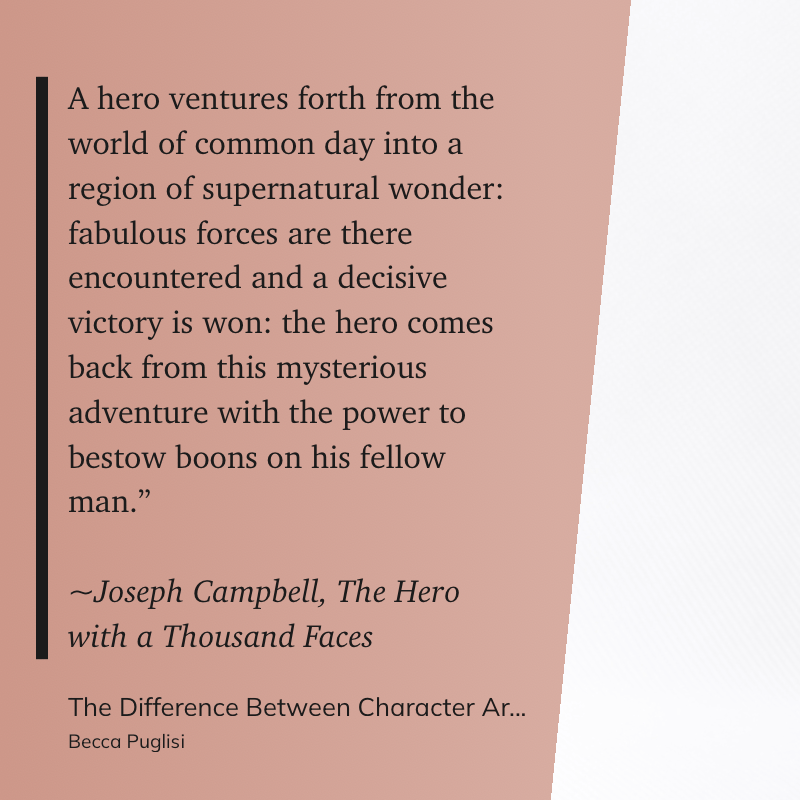 “A hero ventures forth from the world of common day into a region of supernatural wonder: fabulous forces are there encountered and a decisive victory is won: the hero comes back from this mysterious adventure with the power to bestow boons on his fellow man.” — Joseph Campbell, The Hero with a Thousand Faces (Becca Puglisi, The Difference Between Character Archetypes and Tropes)
