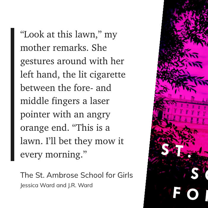 ““Look at this lawn,” my mother remarks. She gestures around with her left hand, the lit cigarette between the fore- and middle fingers a laser pointer with an angry orange end. “This is a lawn. I’ll bet they mow it every morning.”” (Jessica Ward and J.R. Ward, The St. Ambrose School for Girls)