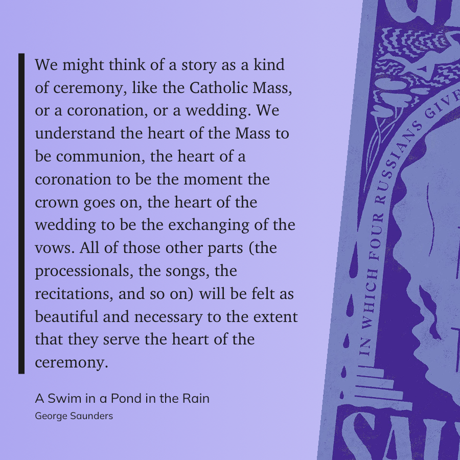 “We might think of a story as a kind of ceremony, like the Catholic Mass, or a coronation, or a wedding. We understand the heart of the Mass to be communion, the heart of a coronation to be the moment the crown goes on, the heart of the wedding to be the exchanging of the vows. All of those other parts (the processionals, the songs, the recitations, and so on) will be felt as beautiful and necessary to the extent that they serve the heart of the ceremony.” (George Saunders, A Swim in a Pond in the Rain)