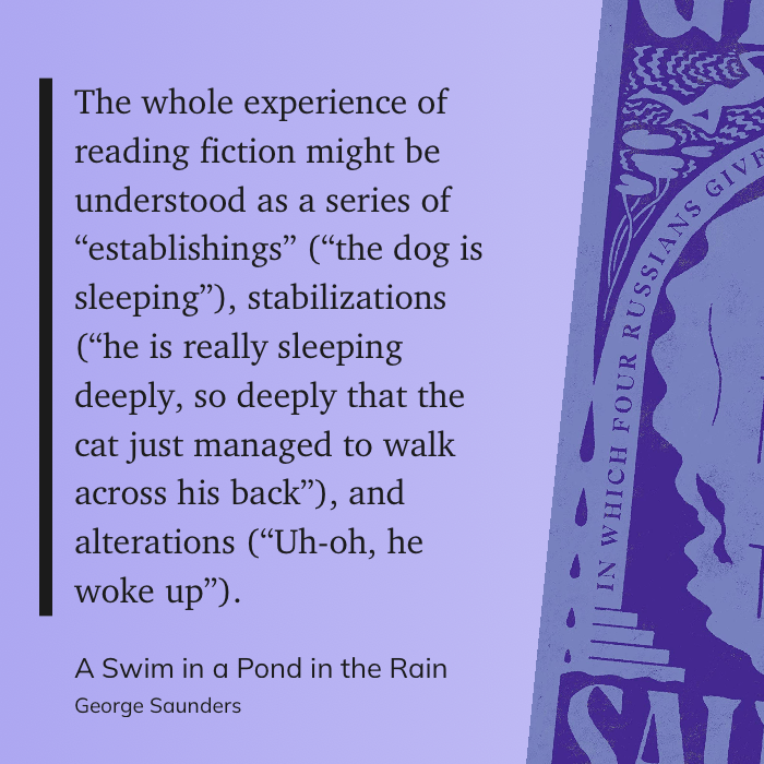 “The whole experience of reading fiction might be understood as a series of “establishings” (“the dog is sleeping”), stabilizations (“he is really sleeping deeply, so deeply that the cat just managed to walk across his back”), and alterations (“Uh-oh, he woke up”).” (George Saunders, A Swim in a Pond in the Rain)