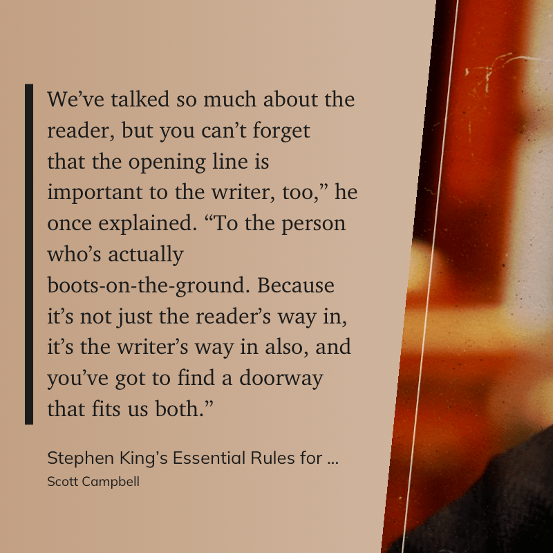 “We’ve talked so much about the reader, but you can’t forget that the opening line is important to the writer, too,” he once explained. “To the person who’s actually boots-on-the-ground. Because it’s not just the reader’s way in, it’s the writer’s way in also, and you’ve got to find a doorway that fits us both.”” (Scott Campbell, Stephen King’s Essential Rules for Writers)
