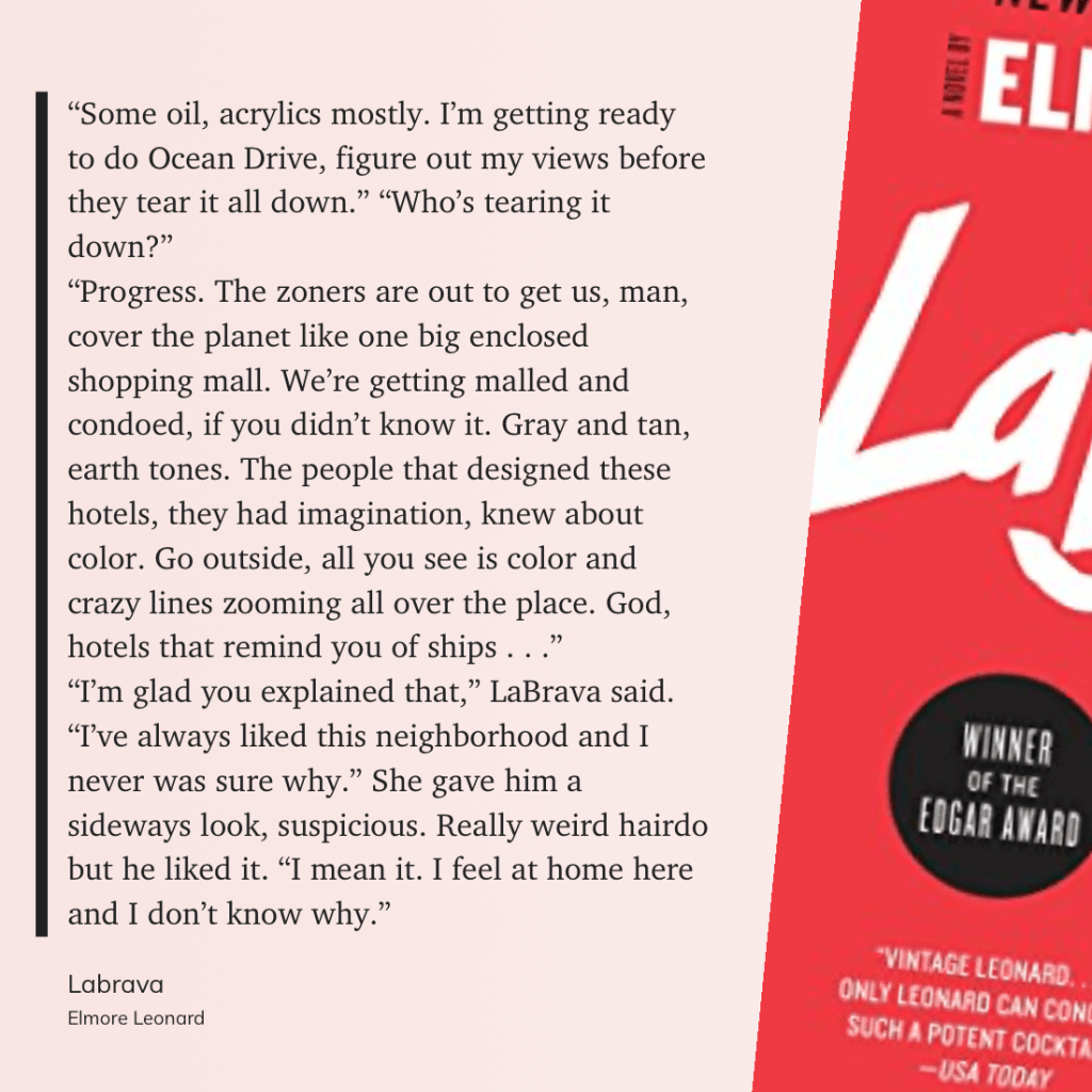 “I’m glad you explained that,” LaBrava said. “I’ve always liked this neighborhood and I never was sure why.” She gave him a sideways look, suspicious. Really weird hairdo but he liked it. “I mean it. I feel at home here and I don’t know why.”” (Elmore Leonard, Labrava)