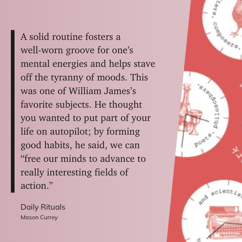“A solid routine fosters a well-worn groove for one’s mental energies and helps stave off the tyranny of moods. This was one of William James’s favorite subjects. He had thought you wanted to put part of your life on autopilot; by forming good habits, he said, we can “free our minds to advance to really interesting fields of action.”” (Mason Currey, Daily Rituals)