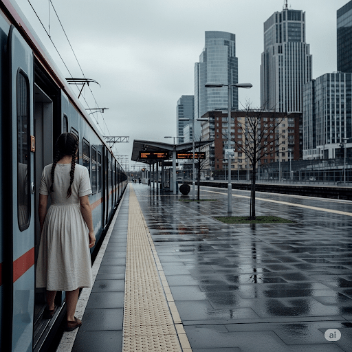 A traveler exits a train onto a wet platform, the towering cityscape a stark reminder of a quieter past. Created with Gemini for a scene-setting exercise.