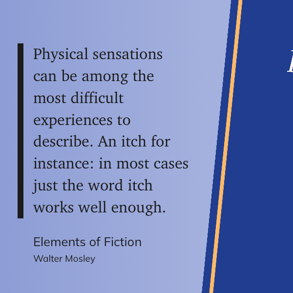 “Physical sensations can be among the most difficult experiences to describe. An itch for instance: in most cases just the word itch works well enough.” (Walter Mosley, Elements of Fiction)