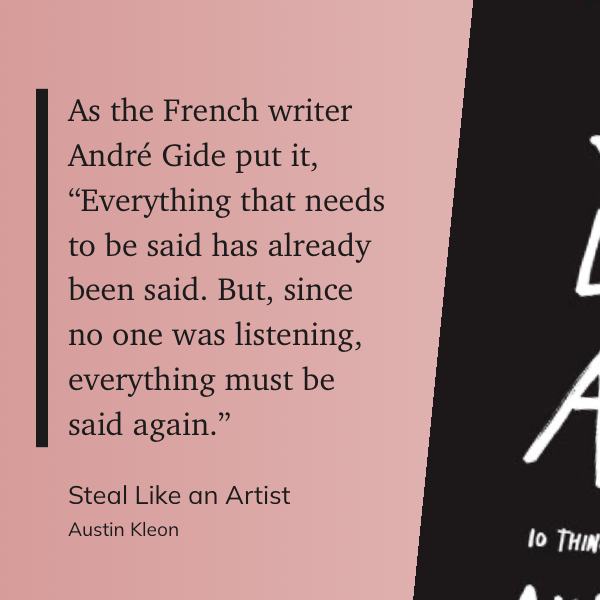 “As the French writer André Gide put it, “Everything that needs to be said has already been said. But, since no one was listening, everything must be said again.”” (Austin Kleon, Steal Like an Artist)