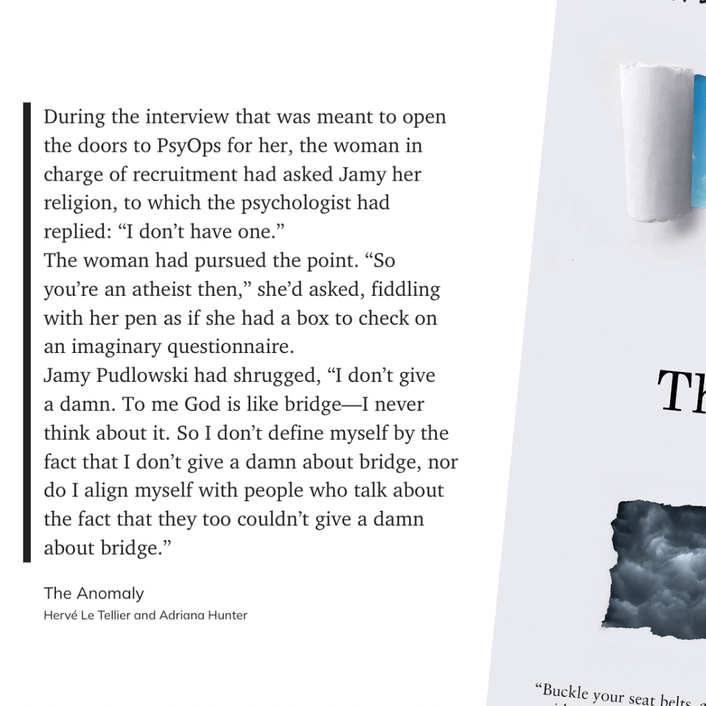 Jamy Pudlowski had shrugged, “I don’t give a damn. To me God is like bridge—I never think about it. So I don’t define myself by the fact that I don’t give a damn about bridge, nor do I align myself with people who talk about the fact that they too couldn’t give a damn about bridge.”” (Hervé Le Tellier and Adriana Hunter, The Anomaly)