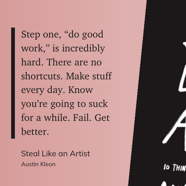 “Step one, “do good work,” is incredibly hard. There are no shortcuts. Make stuff every day. Know you’re going to suck for a while. Fail. Get better.” (Austin Kleon, Steal Like an Artist)
