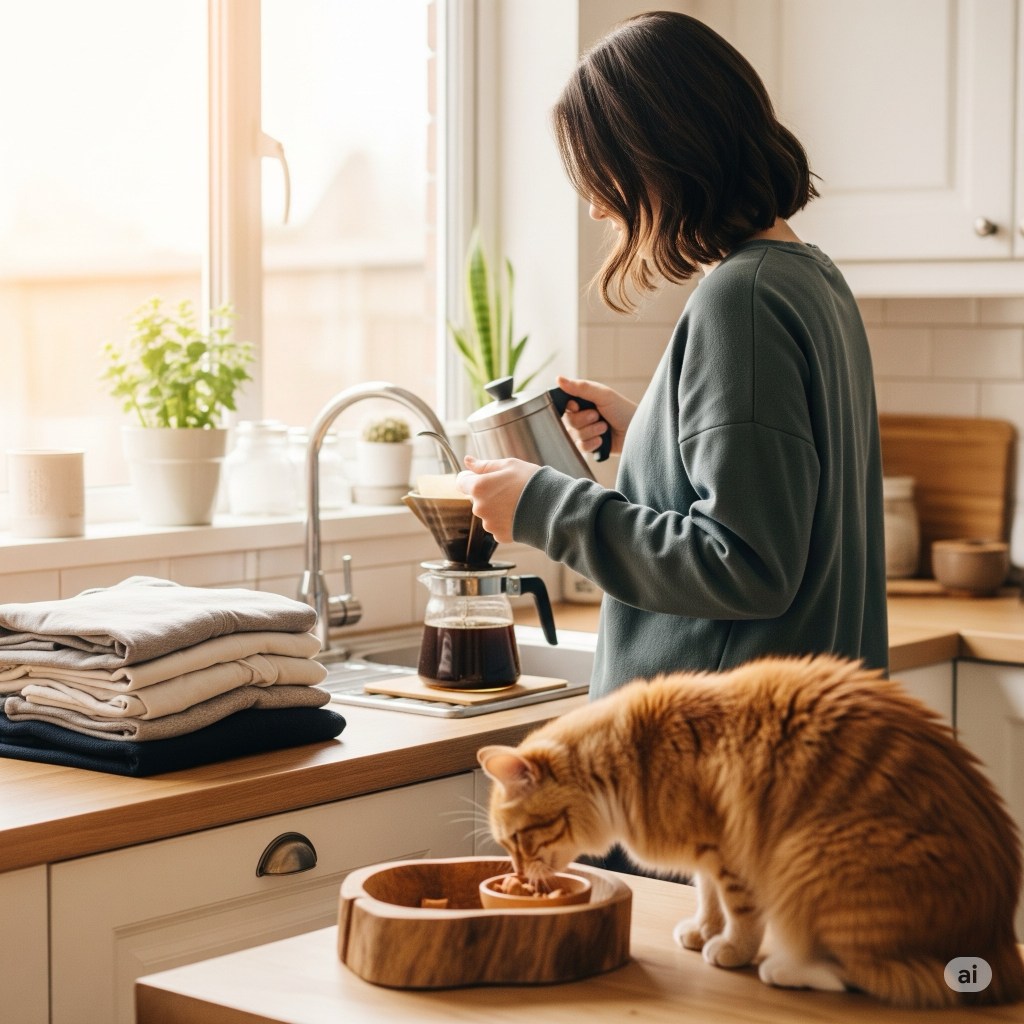 Write a 500-word scene in which your character performs an ordinary task—brewing coffee, folding laundry, feeding a pet—but their emotional state is adrift, submerged beneath the action. You may not name or explain their emotions. Let the emotional truth emerge through how they move, what they notice, what they fumble or repeat.