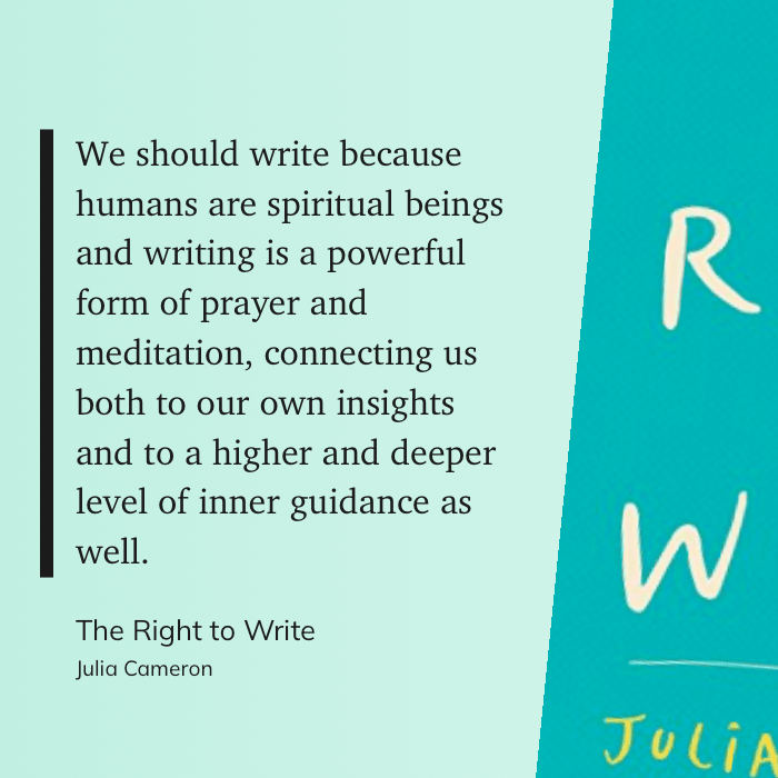 “We should write because humans are spiritual beings and writing is a powerful form of prayer and meditation, connecting us both to our own insights and to a higher and deeper level of inner guidance as well.” (Julia Cameron, The Right to Write)