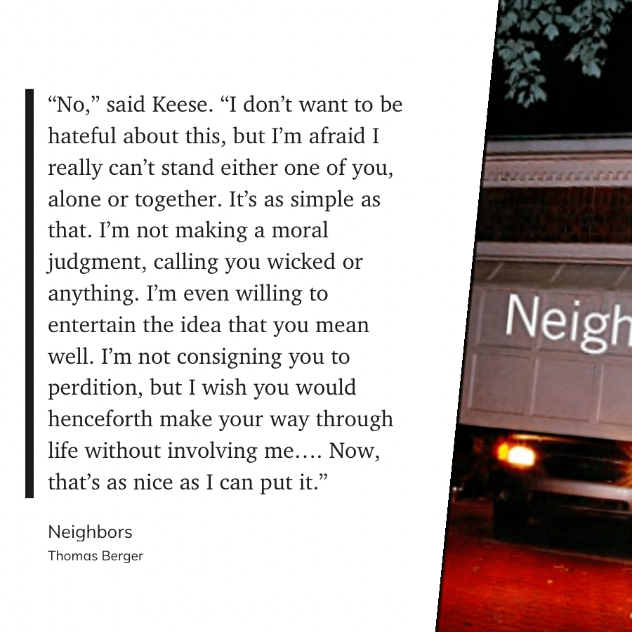 ““No,” said Keese. “I don’t want to be hateful about this, but I’m afraid I really can’t stand either one of you, alone or together. It’s as simple as that. I’m not making a moral judgment, calling you wicked or anything. I’m even willing to entertain the idea that you mean well. I’m not consigning you to perdition, but I wish you would henceforth make your way through life without involving me…. Now, that’s as nice as I can put it.”” (Thomas Berger, Neighbors)