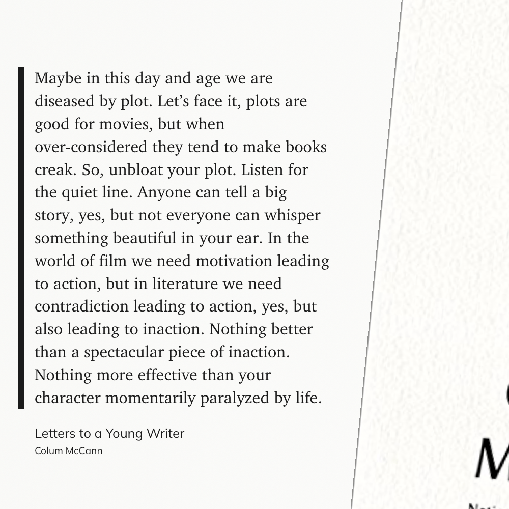 “Maybe in this day and age we are diseased by plot. Let’s face it, plots are good for movies, but when over-considered they tend to make books creak. So, unbloat your plot. Listen for the quiet line. Anyone can tell a big story, yes, but not everyone can whisper something beautiful in your ear. In the world of film we need motivation leading to action, but in literature we need contradiction leading to action, yes, but also leading to inaction. Nothing better than a spectacular piece of inaction. Nothing more effective than your character momentarily paralyzed by life.” (Colum McCann , Letters to a Young Writer)