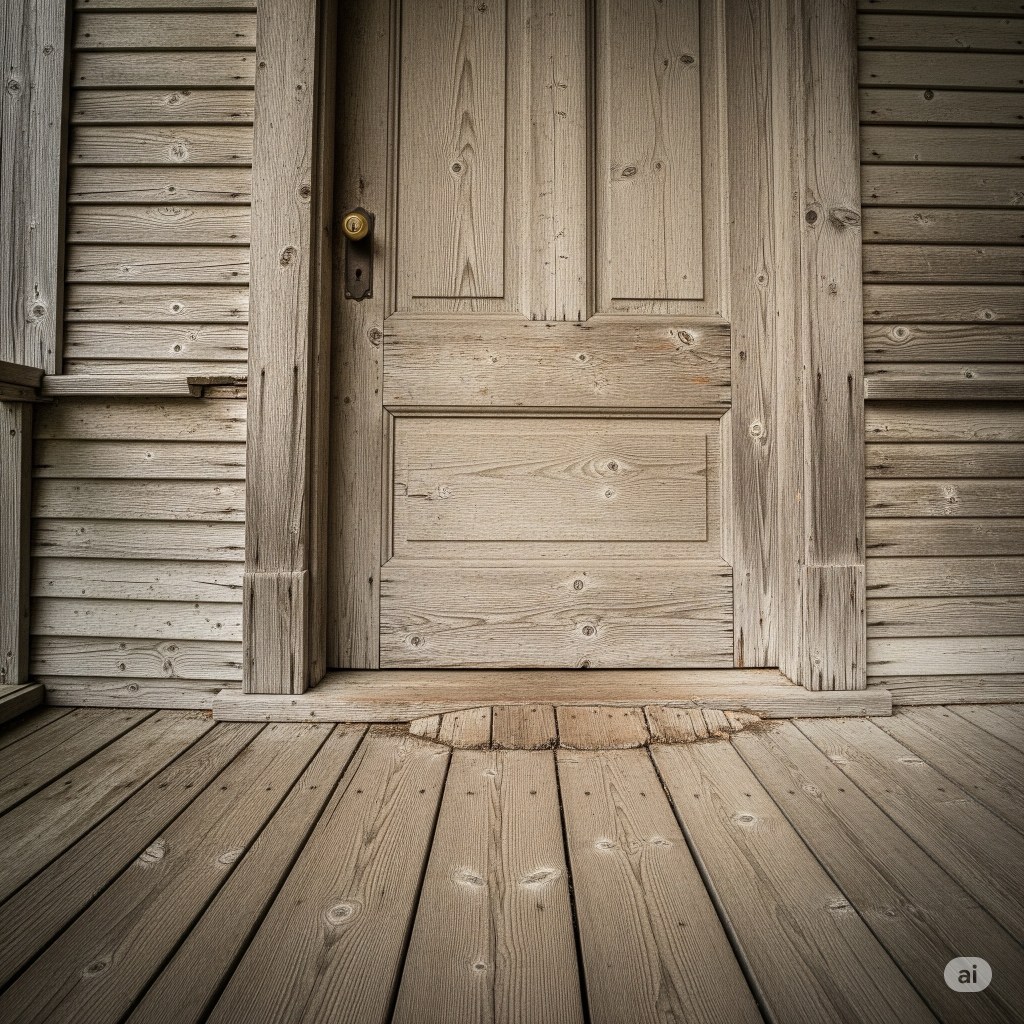 The porch boards creak under her boots. The doorframe leans slightly, swollen at the bottom where the rain always pooled. She touches the brass knob, cool despite the sun. She used to press her forehead there before going in, when it was safer to pause than enter.