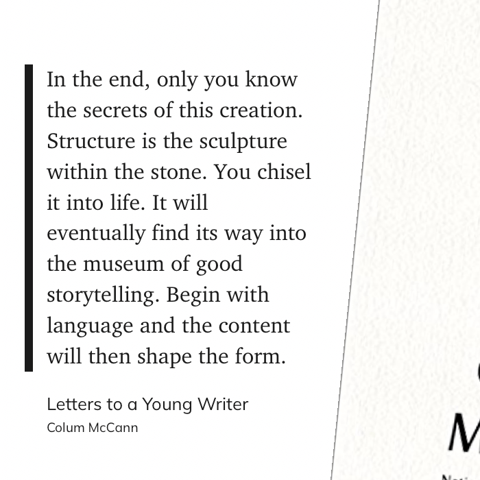 “In the end, only you know the secrets of this creation. Structure is the sculpture within the stone. You chisel it into life. It will eventually find its way into the museum of good storytelling. Begin with language and the content will then shape the form.” (Colum McCann , Letters to a Young Writer)