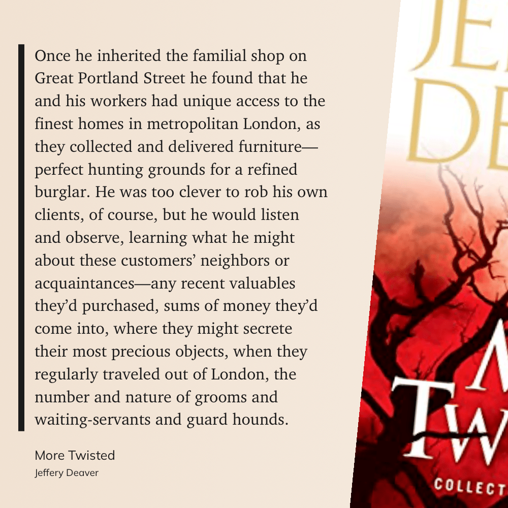 “Once he inherited the familial shop on Great Portland Street he found that he and his workers had unique access to the finest homes in metropolitan London, as they collected and delivered furniture—perfect hunting grounds for a refined burglar. He was too clever to rob his own clients, of course, but he would listen and observe, learning what he might about these customers’ neighbors or acquaintances—any recent valuables they’d purchased, sums of money they’d come into, where they might secrete their most precious objects, when they regularly traveled out of London, the number and nature of grooms and waiting-servants and guard hounds.” (Jeffery Deaver, More Twisted)