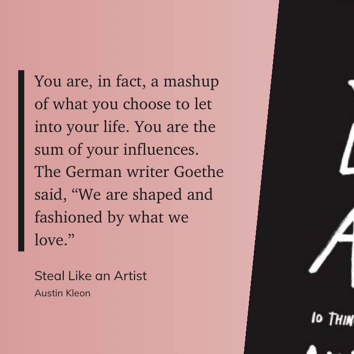 “You are, in fact, a mashup of what you choose to let into your life. You are the sum of your influences. The German writer Goethe said, “We are shaped and fashioned by what we love.”” (Austin Kleon, Steal Like an Artist)