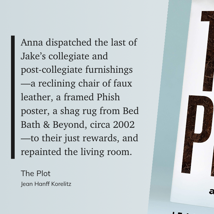 “Anna dispatched the last of Jake’s collegiate and post-collegiate furnishings—a reclining chair of faux leather, a framed Phish poster, a shag rug from Bed Bath & Beyond, circa 2002—to their just rewards, and repainted the living room.” (Jean Hanff Korelitz, The Plot)