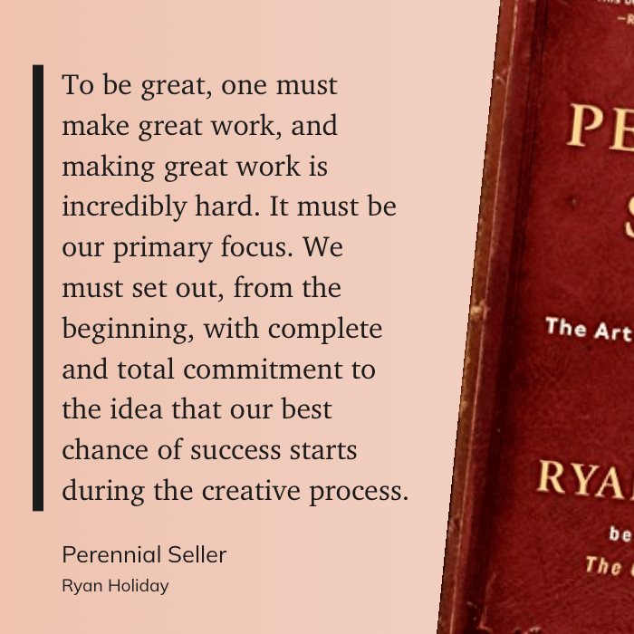 “To be great, one must make great work, and making great work is incredibly hard. It must be our primary focus. We must set out, from the beginning, with complete and total commitment to the idea that our best chance of success starts during the creative process.” (Ryan Holiday, Perennial Seller)