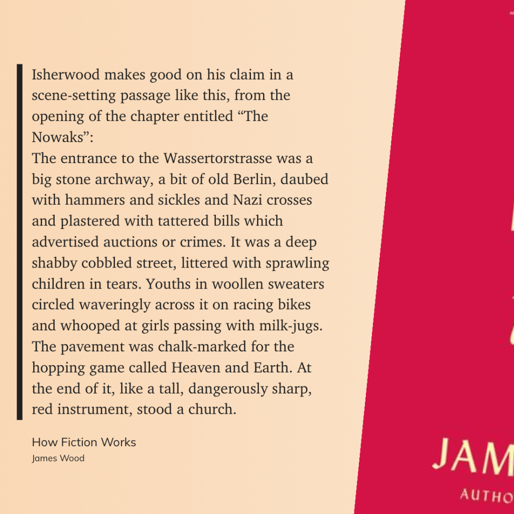 The entrance to the Wassertorstrasse was a big stone archway, a bit of old Berlin, daubed with hammers and sickles and Nazi crosses and plastered with tattered bills which advertised auctions or crimes. It was a deep shabby cobbled street, littered with sprawling children in tears. Youths in woollen sweaters circled waveringly across it on racing bikes and whooped at girls passing with milk-jugs. The pavement was chalk-marked for the hopping game called Heaven and Earth. At the end of it, like a tall, dangerously sharp, red instrument, stood a church.” (James Wood, How Fiction Works)