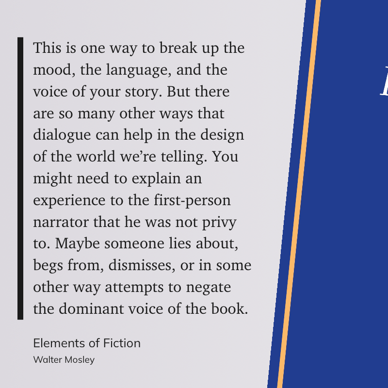 “This is one way to break up the mood, the language, and the voice of your story. But there are so many other ways that dialogue can help in the design of the world we’re telling. You might need to explain an experience to the first-person narrator that he was not privy to. Maybe someone lies about, begs from, dismisses, or in some other way attempts to negate the dominant voice of the book.” (Walter Mosley, Elements of Fiction)