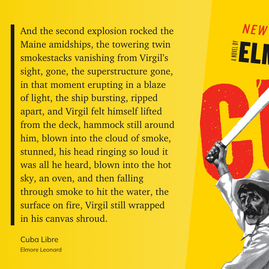 “And the second explosion rocked the Maine amidships, the towering twin smokestacks vanishing from Virgil’s sight, gone, the superstructure gone, in that moment erupting in a blaze of light, the ship bursting, ripped apart, and Virgil felt himself lifted from the deck, hammock still around him, blown into the cloud of smoke, stunned, his head ringing so loud it was all he heard, blown into the hot sky, an oven, and then falling through smoke to hit the water, the surface on fire, Virgil still wrapped in his canvas shroud.” (Elmore Leonard, Cuba Libre)