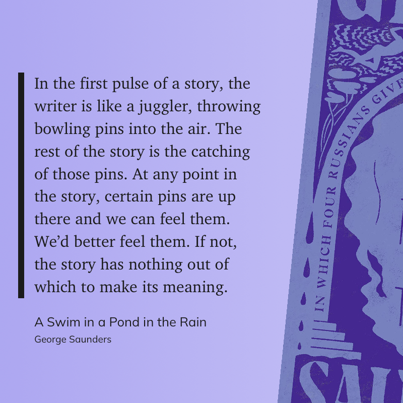 “In the first pulse of a story, the writer is like a juggler, throwing bowling pins into the air. The rest of the story is the catching of those pins. At any point in the story, certain pins are up there and we can feel them. We’d better feel them. If not, the story has nothing out of which to make its meaning.” (George Saunders, A Swim in a Pond in the Rain)