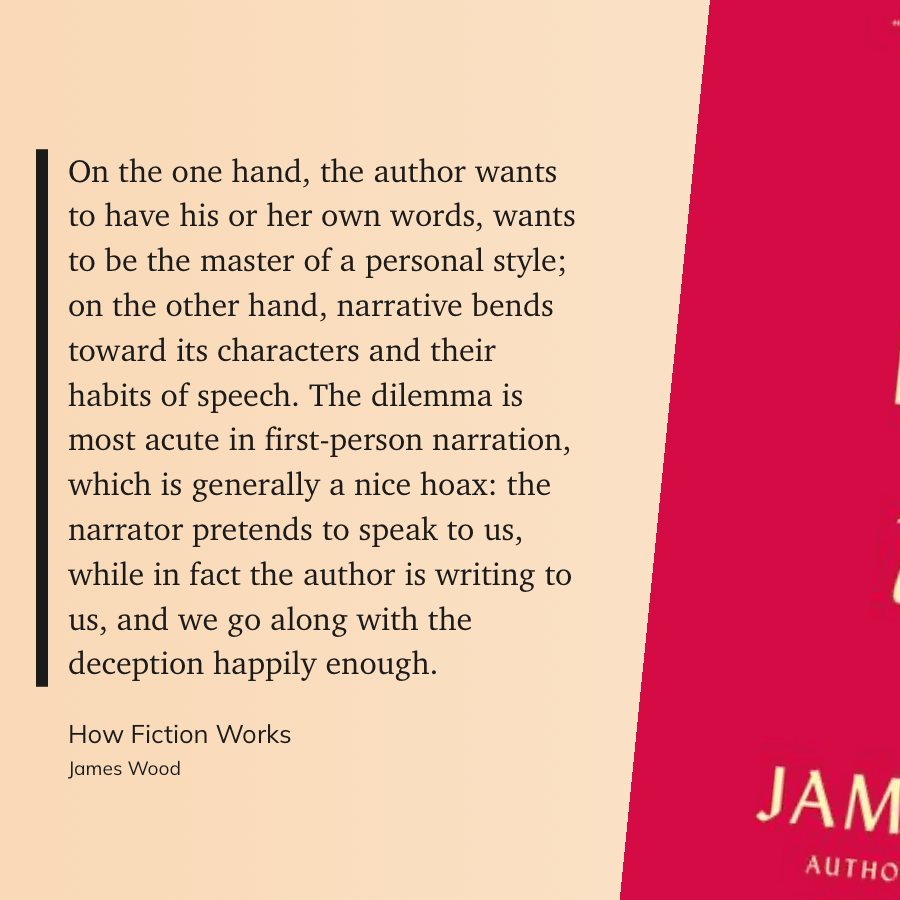 “On the one hand, the author wants to have his or her own words, wants to be the master of a personal style; on the other hand, narrative bends toward its characters and their habits of speech. The dilemma is most acute in first-person narration, which is generally a nice hoax: the narrator pretends to speak to us, while in fact the author is writing to us, and we go along with the deception happily enough.” (James Wood, How Fiction Works)