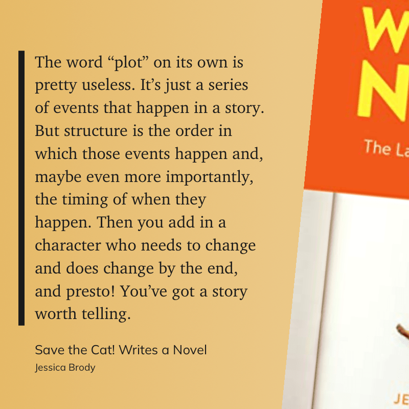 “The word “plot” on its own is pretty useless. It’s just a series of events that happen in a story. But structure is the order in which those events happen and, maybe even more importantly, the timing of when they happen. Then you add in a character who needs to change and does change by the end, and presto! You’ve got a story worth telling.” (Jessica Brody, Save the Cat! Writes a Novel)