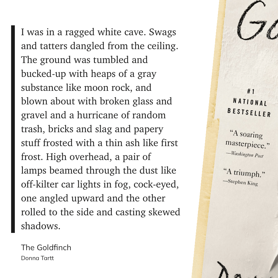 “I was in a ragged white cave. Swags and tatters dangled from the ceiling. The ground was tumbled and bucked-up with heaps of a gray substance like moon rock, and blown about with broken glass and gravel and a hurricane of random trash, bricks and slag and papery stuff frosted with a thin ash like first frost. High overhead, a pair of lamps beamed through the dust like off-kilter car lights in fog, cock-eyed, one angled upward and the other rolled to the side and casting skewed shadows.” (Donna Tartt, The Goldfinch)