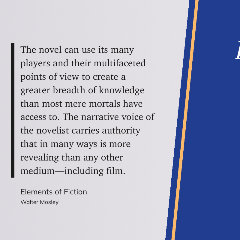 “The novel can use its many players and their multifaceted points of view to create a greater breadth of knowledge than most mere mortals have access to. The narrative voice of the novelist carries authority that in many ways is more revealing than any other medium—including film.” (Walter Mosley, Elements of Fiction)