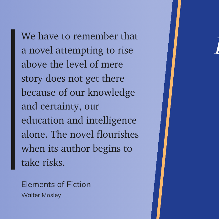 “We have to remember that a novel attempting to rise above the level of mere story does not get there because of our knowledge and certainty, our education and intelligence alone. The novel flourishes when its author begins to take risks.” (Walter Mosley, Elements of Fiction)