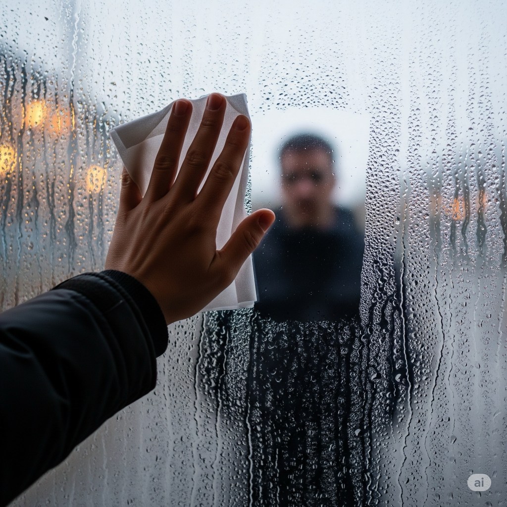 A protagonist wipes condensation from a café window, revealing the faint outline of a person outside. This image was generated by Gemini.