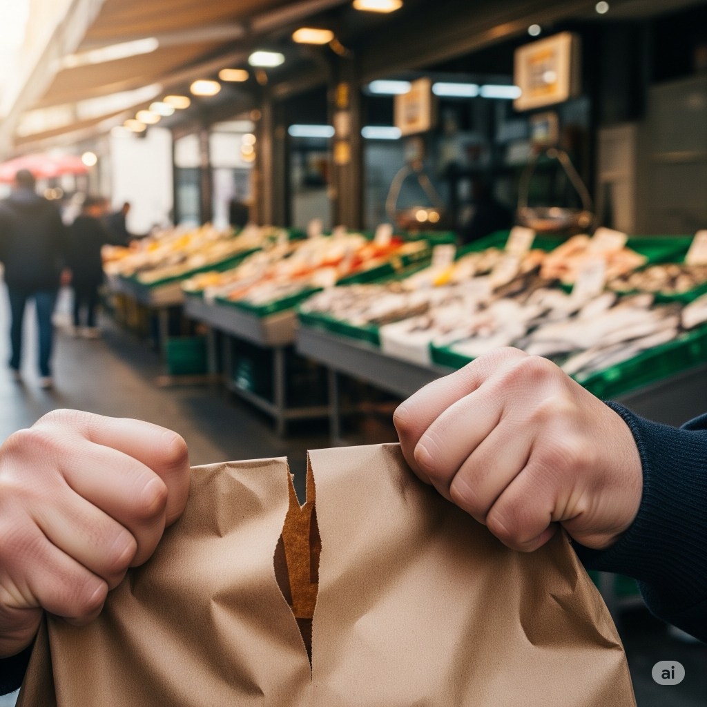 A person’s hands tighten on a paper bag until it splits, in a market with fish stalls nearby. This image was generated by Gemini.