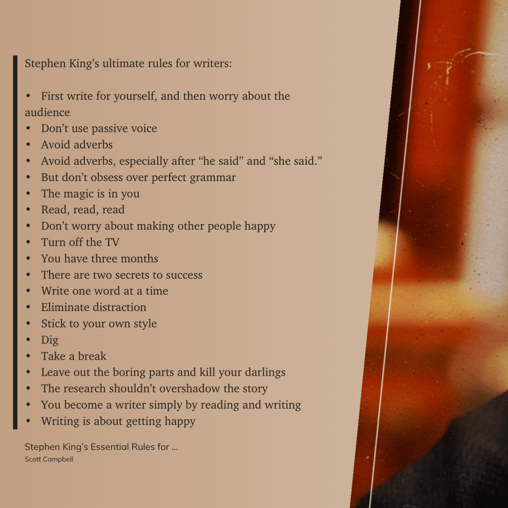 - Writing is about getting happy” (Scott Campbell, Stephen King’s Essential Rules for Writers)