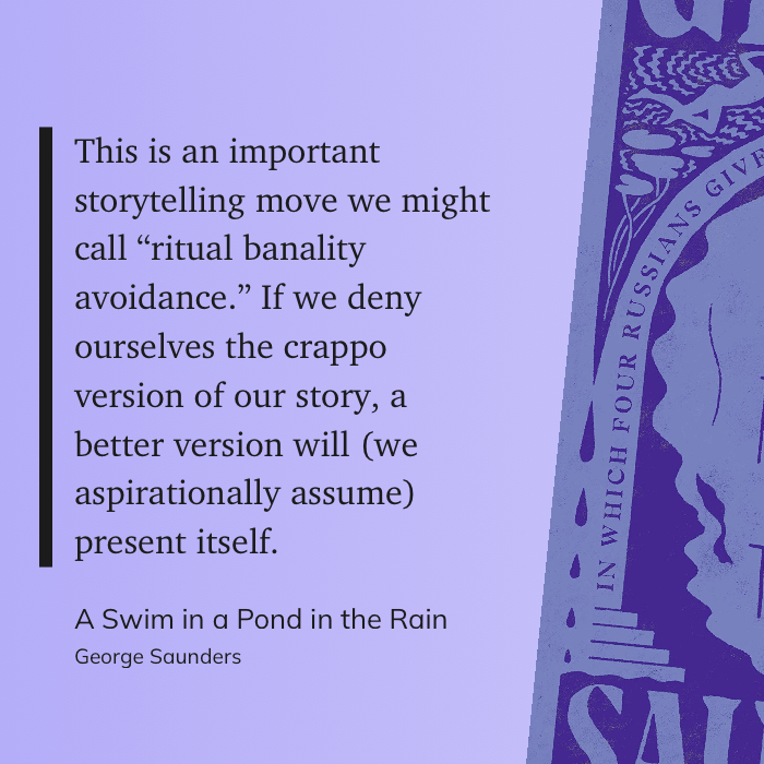 “This is an important storytelling move we might call “ritual banality avoidance.” If we deny ourselves the crappo version of our story, a better version will (we aspirationally assume) present itself.” (George Saunders, A Swim in a Pond in the Rain)