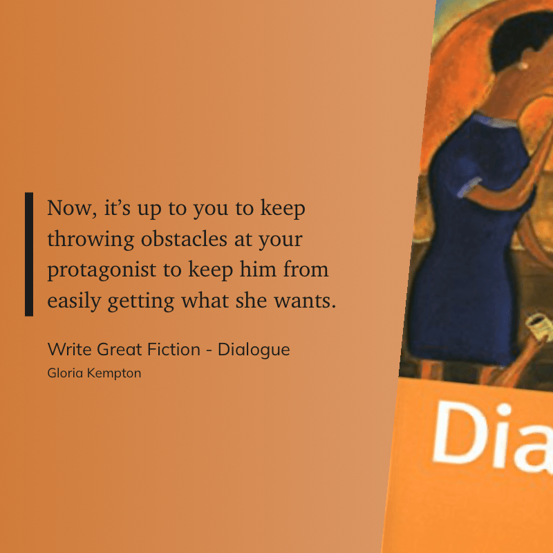 “Now, it’s up to you to keep throwing obstacles at your protagonist to keep him from easily getting what she wants.” (Gloria Kempton, Write Great Fiction – Dialogue)