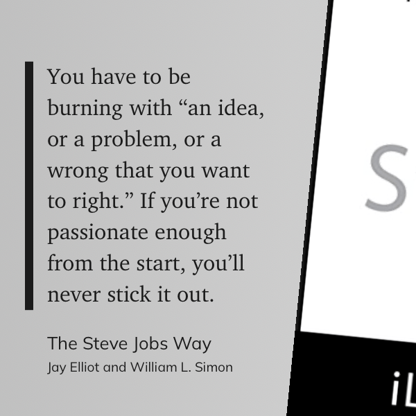 “You have to be burning with “an idea, or a problem, or a wrong that you want to right.” If you’re not passionate enough from the start, you’ll never stick it out.” (Jay Elliot and William L. Simon, The Steve Jobs Way)