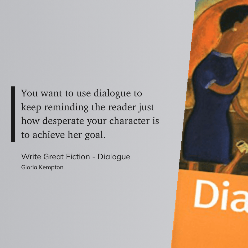 “You want to use dialogue to keep reminding the reader just how desperate your character is to achieve her goal.” (Gloria Kempton, Write Great Fiction – Dialogue)