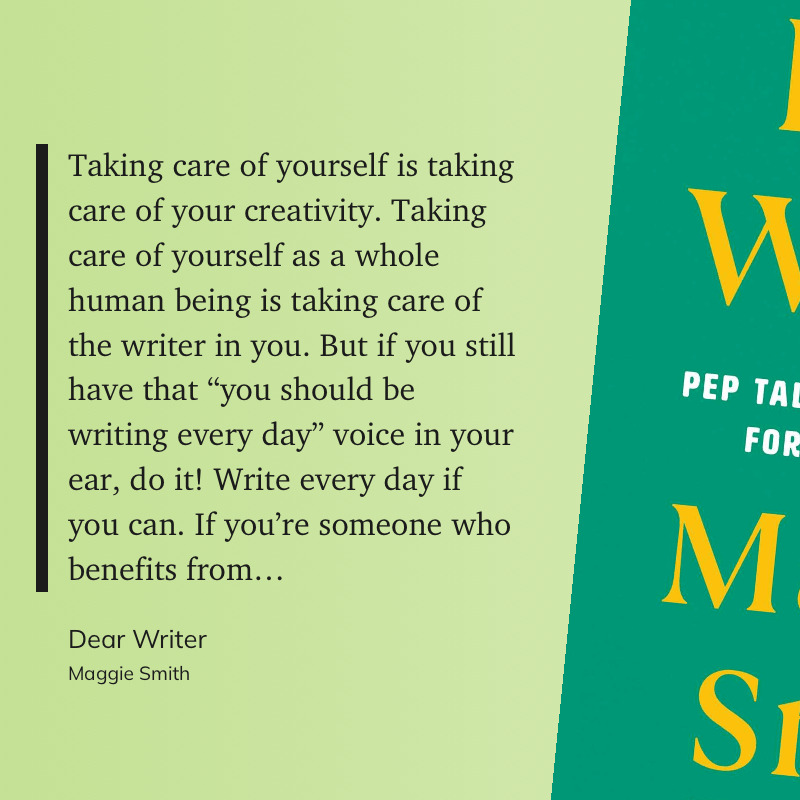 “Taking care of yourself is taking care of your creativity. Taking care of yourself as a whole human being is taking care of the writer in you. But if you still have that “you should be writing every day” voice in your ear, do it! Write every day if you can. If you’re someone who benefits from…” (Maggie Smith, Dear Writer)