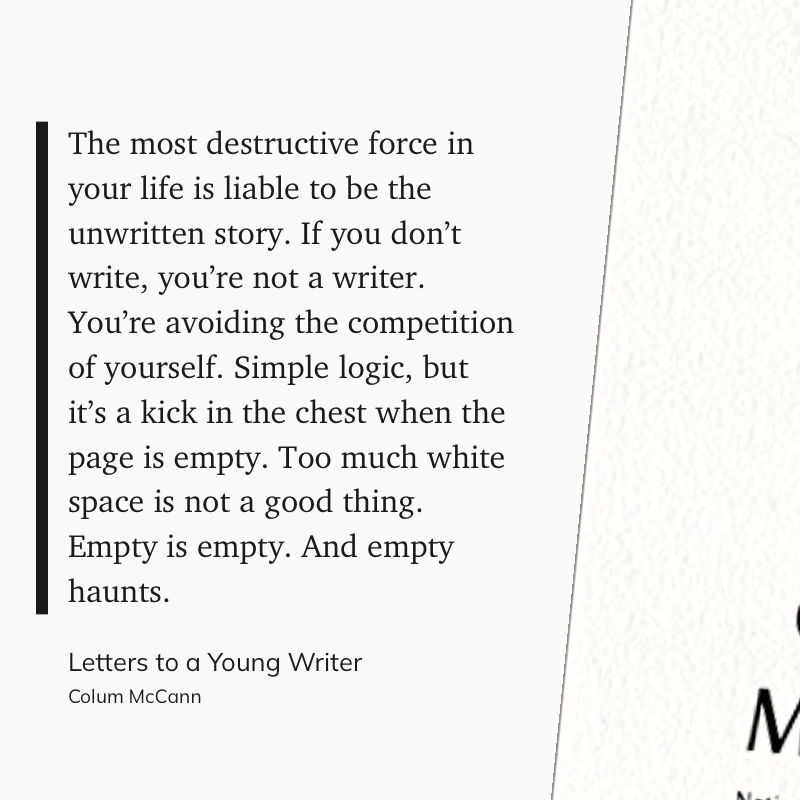 “The most destructive force in your life is liable to be the unwritten story. If you don’t write, you’re not a writer. You’re avoiding the competition of yourself. Simple logic, but it’s a kick in the chest when the page is empty. Too much white space is not a good thing. Empty is empty. And empty haunts.” (Colum McCann , Letters to a Young Writer)