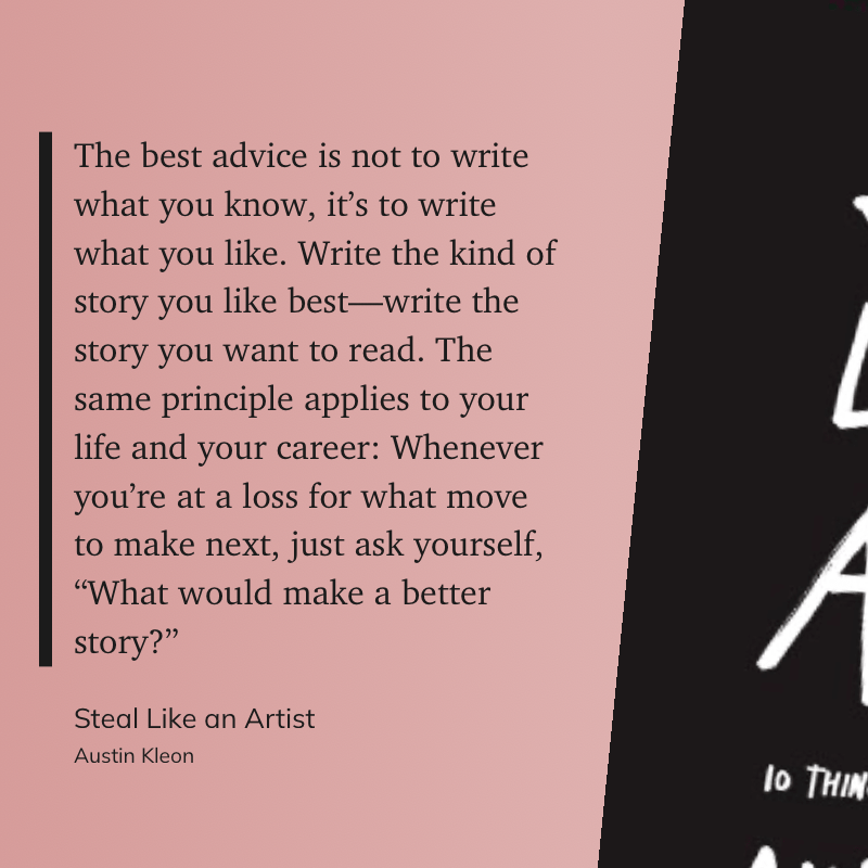 “The best advice is not to write what you know, it’s to write what you like. Write the kind of story you like best—write the story you want to read. The same principle applies to your life and your career: Whenever you’re at a loss for what move to make next, just ask yourself, “What would make a better story?”” (Austin Kleon, Steal Like an Artist)