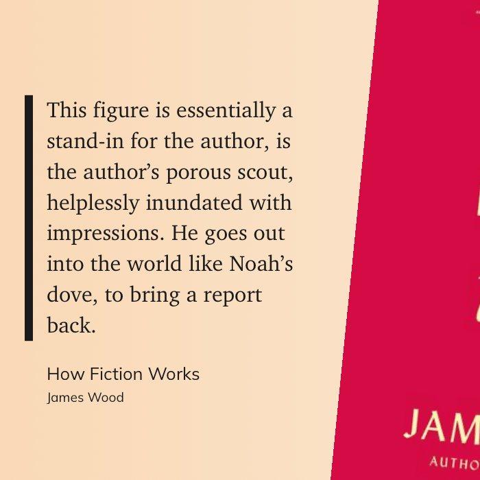“This figure is essentially a stand-in for the author, is the author’s porous scout, helplessly inundated with impressions. He goes out into the world like Noah’s dove, to bring a report back.” (James Wood, How Fiction Works)