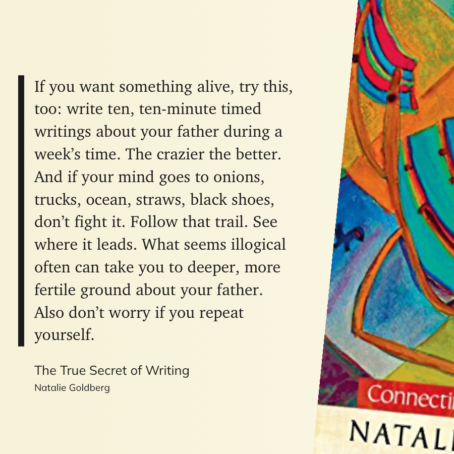 “If you want something alive, try this, too: write ten, ten-minute timed writings about your father during a week’s time. The crazier the better. And if your mind goes to onions, trucks, ocean, straws, black shoes, don’t fight it. Follow that trail. See where it leads. What seems illogical often can take you to deeper, more fertile ground about your father. Also don’t worry if you repeat yourself.” (Natalie Goldberg, The True Secret of Writing)