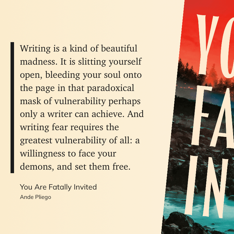 “Writing is a kind of beautiful madness. It is slitting yourself open, bleeding your soul onto the page in that paradoxical mask of vulnerability perhaps only a writer can achieve. And writing fear requires the greatest vulnerability of all: a willingness to face your demons, and set them free.” (Ande Pliego, You Are Fatally Invited)