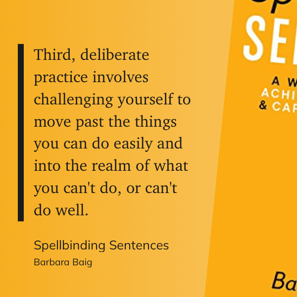 “Third, deliberate practice involves challenging yourself to move past the things you can do easily and into the realm of what you can’t do, or can’t do well.” (Barbara Baig, Spellbinding Sentences)