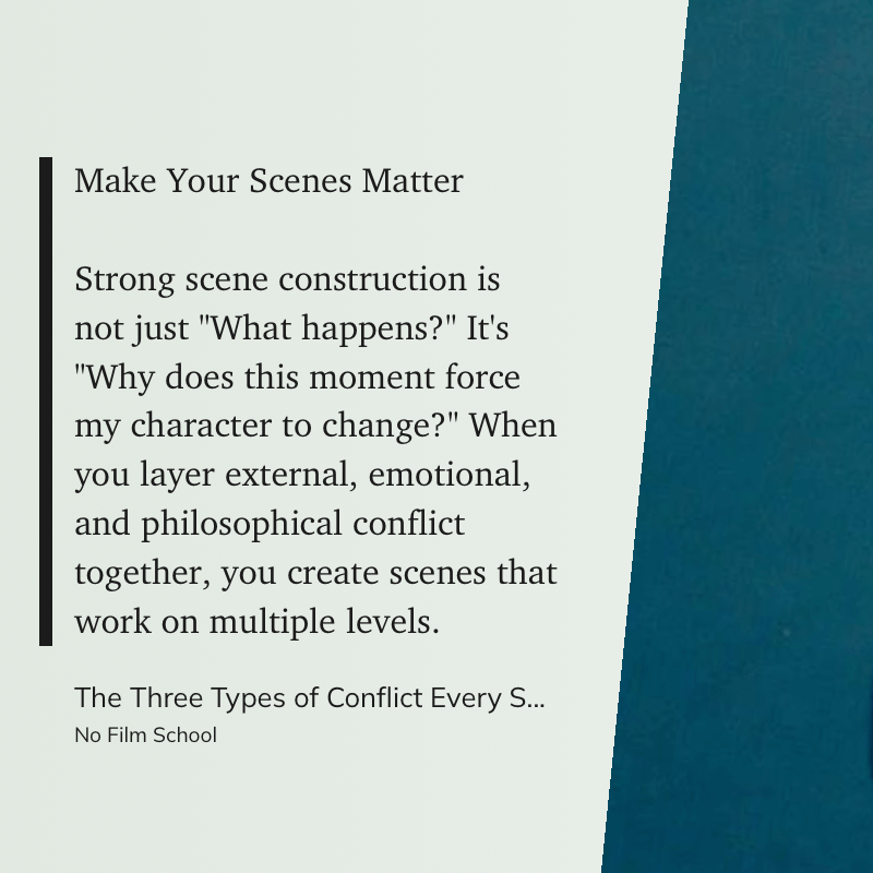 Make Your Scenes Matter. Strong scene construction is not just “What happens?” It’s “Why does this moment force my character to change?” When you layer external, emotional, and philosophical conflict together, you create scenes that work on multiple levels. (No Film School, The Three Types of Conflict Every Scene Needs)